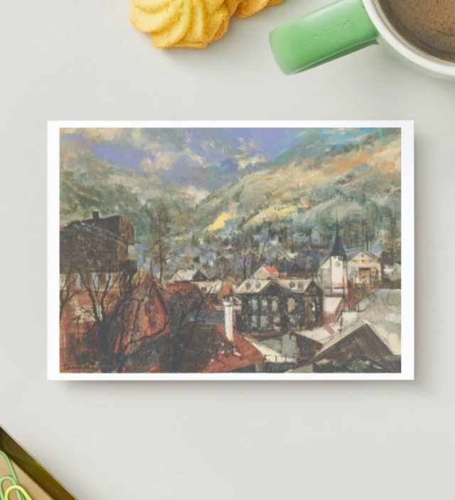 古川美術館所蔵 鶴岡義雄「スイスの風景(インターラーケン)」のポストカードです。 サイズ:A6(14.8 x 10.5cm), デラックス紙, コーティングなし スムーズな質感で温かみのある見た目で、書き込みやすい素材です。
