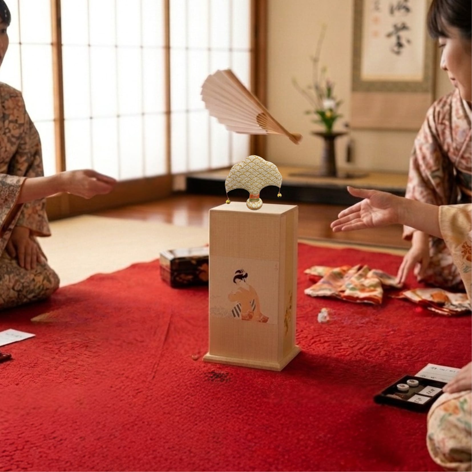 最大の特徴は、左右に添えられた鈴。揺れるたびに優しく響く音色が、競技に風流な彩りを添えてくれます。布地には、枕(土台)の質感を引き立てる上品な柄の金属布を採用しました。軸の輝きと布の柔らかな質感が、投扇興という遊びをより一層格調高いものへと引き上げます。