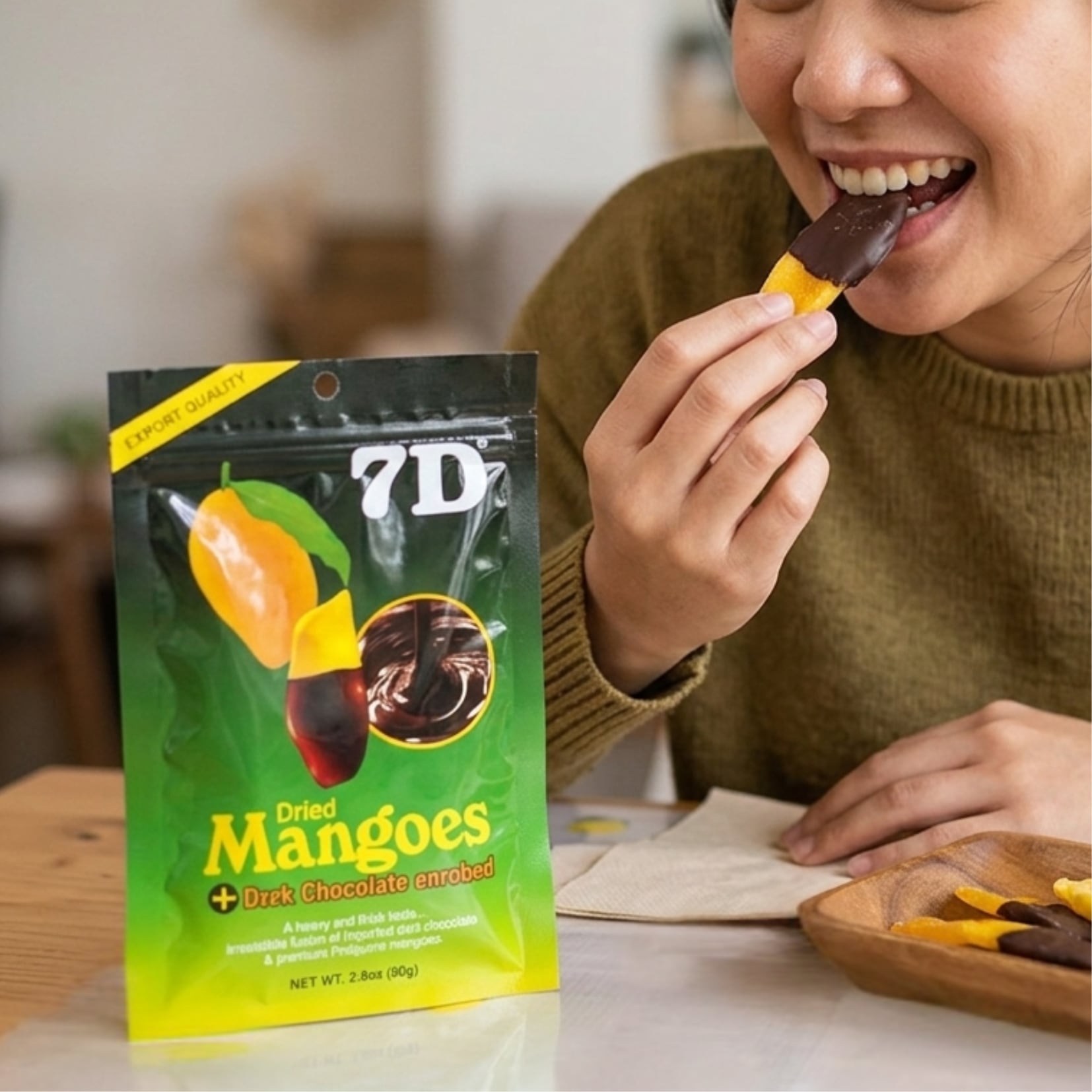 7Dのドライマンゴーに合うチョコレートを厳選しコーティングしました。