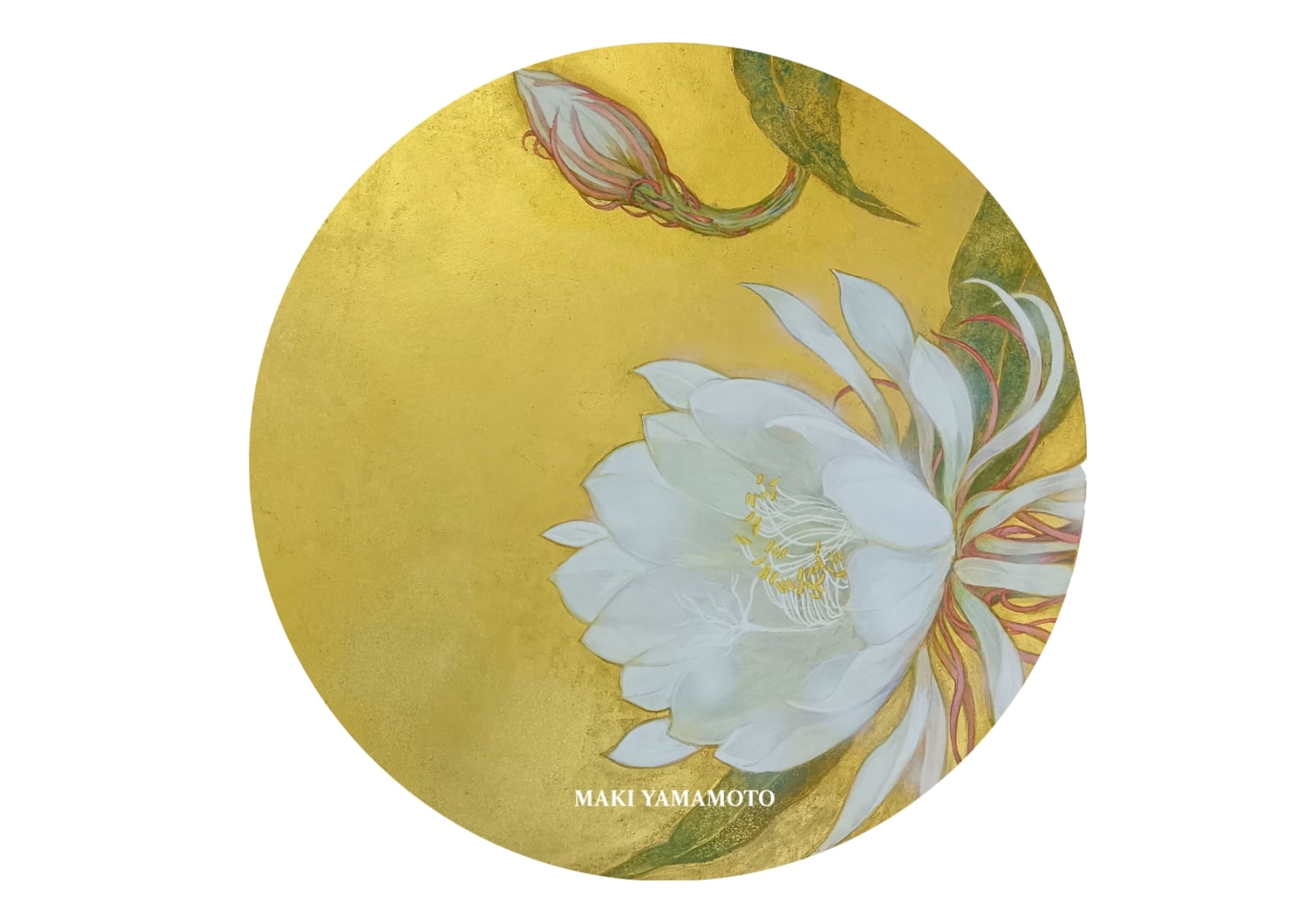 作品の「月下美人」が持つ、神秘的で生命力あふれる世界観を忠実に表現しました。煌めくゴールドは上品で、デスクの雰囲気を格上げします。山本眞希氏の署名(MAKI YAMAMOTO)がアクセントとなった、コレクターズアイテムのような逸品です。