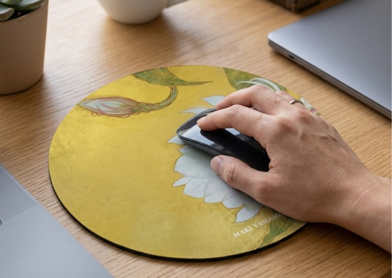 日本画家・山本眞希氏が2025年に描き下ろした名作「月下美人」を、機能的な円形マウスパッドに仕立てました。